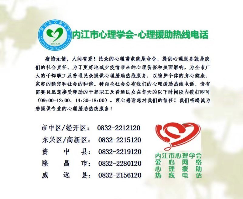 为做好新型冠状病毒肺炎疫情防控工作,尽量减少疫情为干部群众带来的心理伤害和负面影响,内江市心理学会充分发挥专业优势,主动承担社会责任,成立了一支50余人的新型冠状病毒肺炎疫情危机干预应急队伍,开通了5部心理援助热线电话,为有需要和愿意接受帮助的广大干部群众进行心理危机干预和心理援助。截至2月1日,已累计为39人次进行了心理压力疏导,缓解了大家的心理压力,排除了恐慌心理。