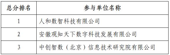10月20日上午9时至12时,该项目比选小组在四川省民政厅组织比选会议,对3家单位响应文件进行评审。经过比选小组评审,在满足需求的基础上,拟确定总分排名第一的人和数智科技有限公司为成交供应商。参与单位排名如下: